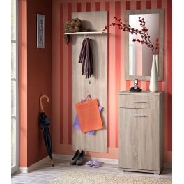 Ensemble de 4 pièces composé d'un miroir, d'un porte-manteau, d'un banc avec rangement à chaussures et d'un meuble à chaussures. Miroir rectangulaire collé sur un panneau de particules (position verticale). Porte-man