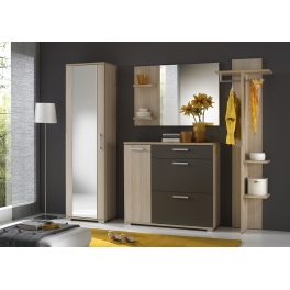 Ensemble de vestiaire comprenant un meuble à chaussures, une armoire-penderie, un porte-manteau et un miroir. Meuble à chaussures à poser, bicolore, composé d'une porte, de deux portes abattantes et d'un tiroir. Armoi