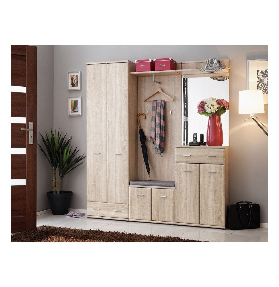 Ensemble de vestiaire comprenant une armoire-penderie, un porte-manteau, deux meubles à chaussures et un miroir. Armoire-penderie avec un tiroir en bas. Derrière les portes il y a une tablette en haut au-dessous de laquell