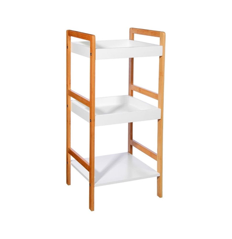 Elégante étagère pour salle de bain. Idéal pour ranger serviettes et/ou accessoires de bain. Structure en bambou pour plus de solidité et de stabilité. Plateau en bois blanc.