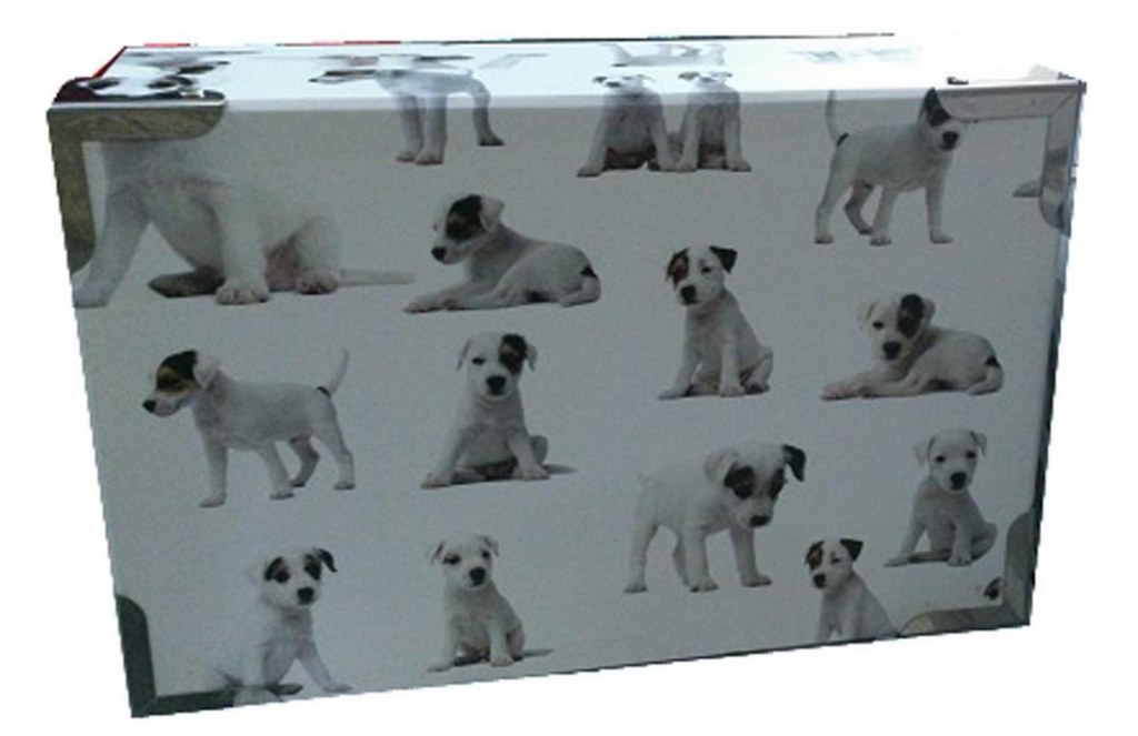 Boite en carton imprimÌe avec angles et poignées en métal.