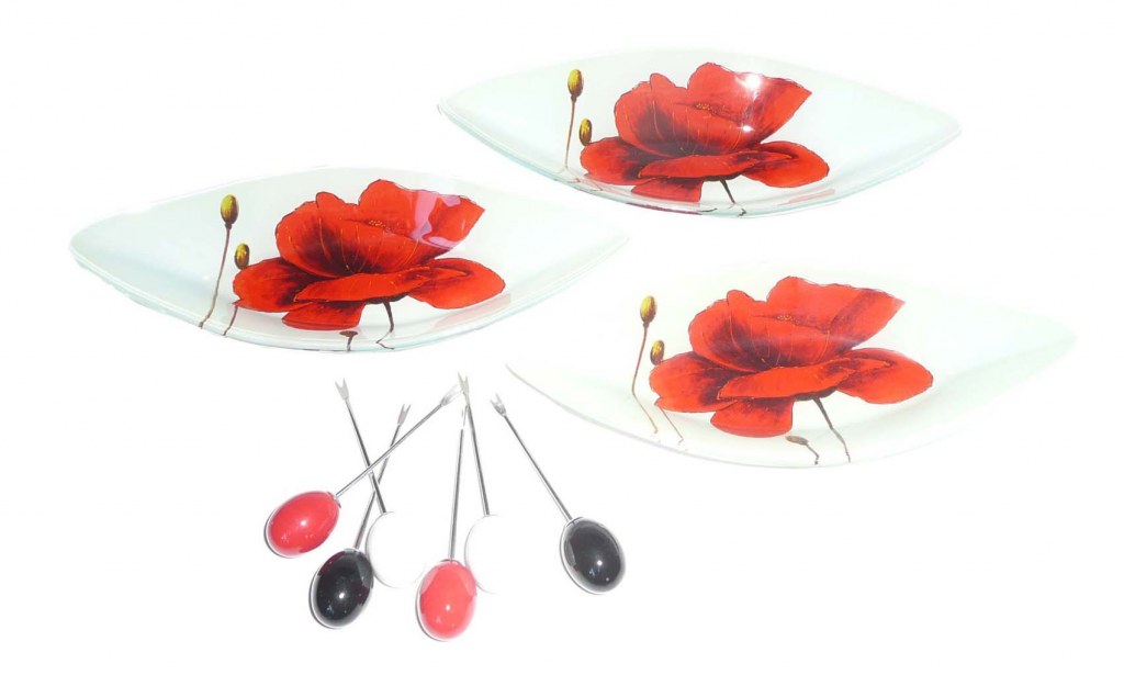 3 Coupelles avec 6 piques motif coquelicot dans une boite avec un couvercle en PVC.