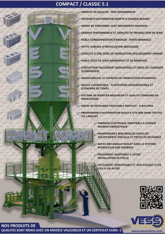 Après plusieurs années dans le secteur de la fabrication des Compact Classic 5.1 : Machine Parpaing occasion ; Machine Pavé occasion ; Machine Agglos occasion ; Machine Bordure occasion, avec notre département de recherches de développement nous avons étudié tous les problèmes que les clients sont rencontres et avons proposé comme solution la nouvelle machine compact. La machine parpaing compact de base a été fait pour convenir à votre budget d'investissement tout en vous permettant d'ajouter les équipements optionnels selon vos besoins. Produits qualité-utiles et livrés avec le Certificat Euro -1
