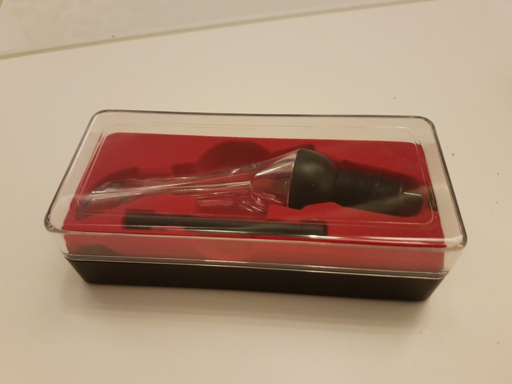 Aérateur de vin composé de 3 morceaux et présenté dans une boite en plexiglass avec un packaging en carton autour.