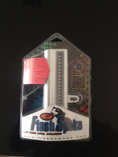 Lot de 400 FlashSpoke.Il s'agit d'une barre led, qui se fixe sur les rayons d'un velo, contenant 24 motifs en 7 couleurs, ainsi qu'un message programmable que l'on peut saisir directement sur le FlashSpoke.