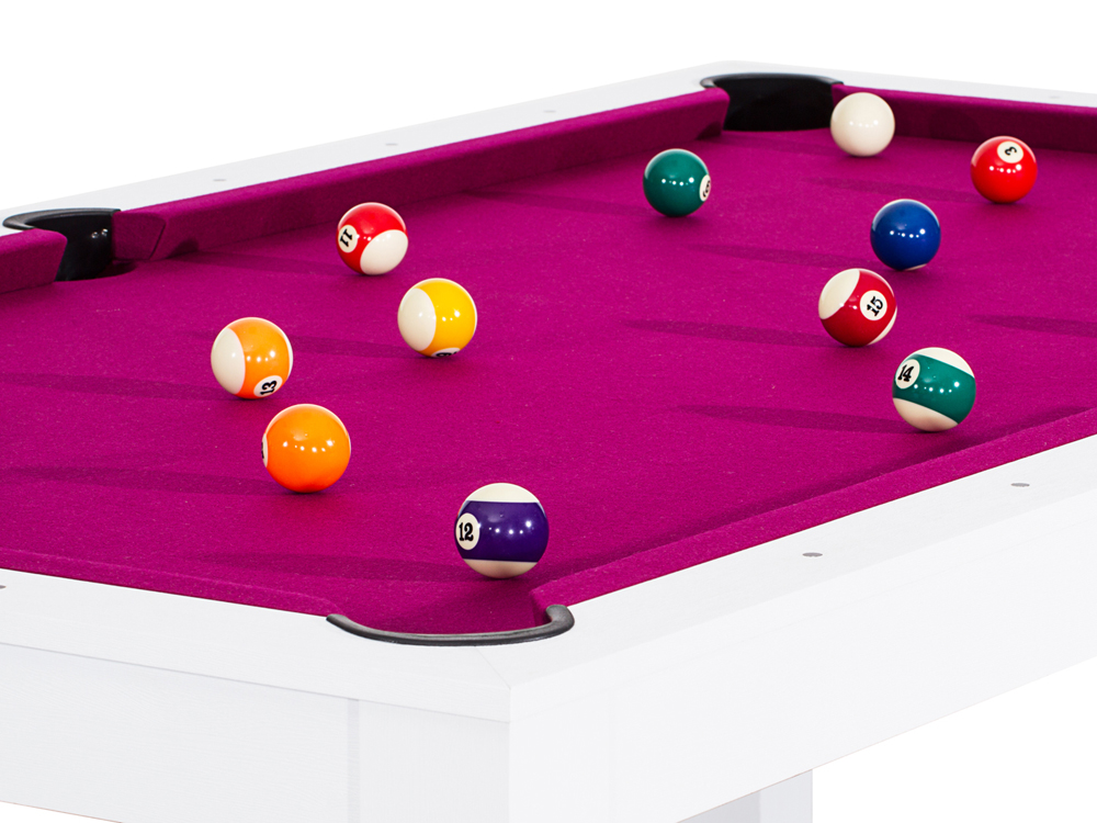 Cette table présente 6 poches dotées d'une toile étirable de haute élégance. D'une longueur de 2,14m pour une largeur de 1,25m et une hauteur de 81cm, cette table aux dimensions standards d'un billard américain vous permettra d'accueillir aisément jusqu'à 8 convives.