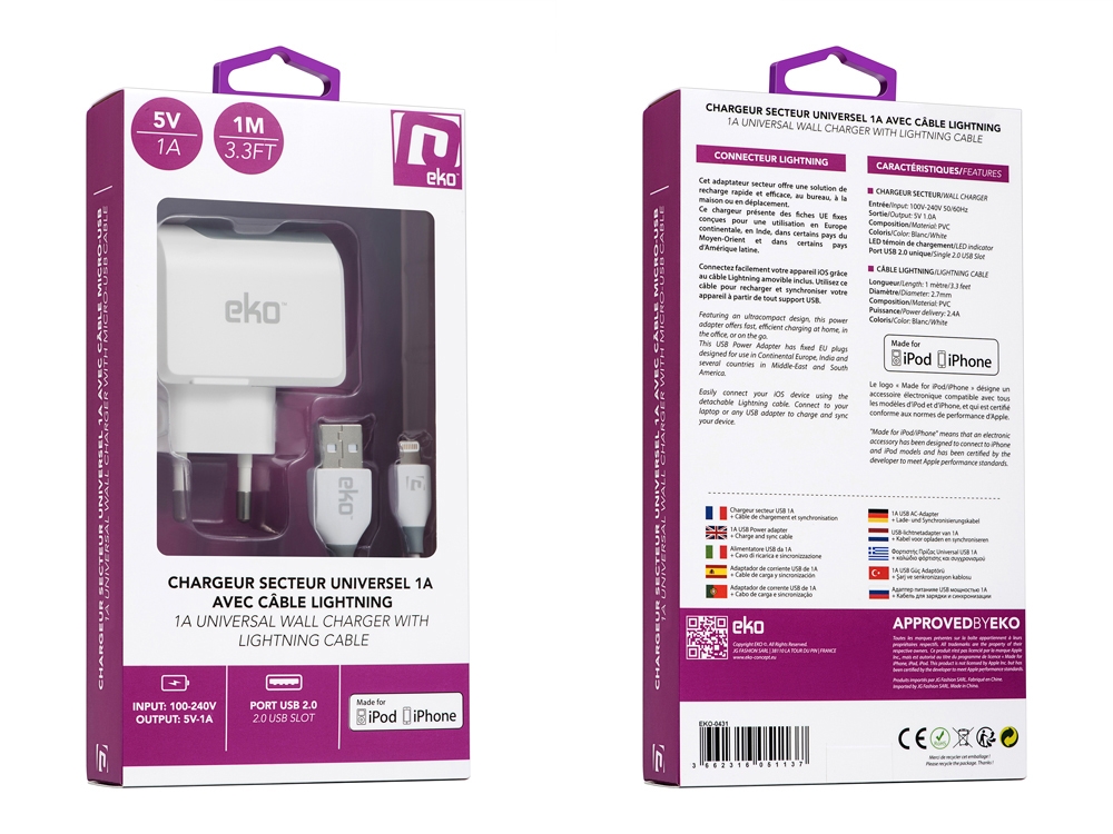 Plus jamais à court de batterie ! Les chargeurs secteur Eko vous permettent de recharger la plupart des appareils disponibles sur le marché. Ils se révéleront vite indispensables ! Dotés d'un design compact aux lignes épurées, ce modèle répondant aux standards européens vous permettra de ne jamais plus être à court de batterie.