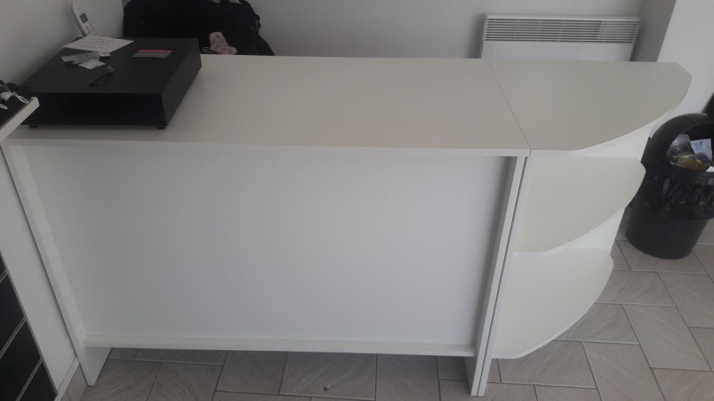 comptoir d'angle blanc mat, très bon état, peu servi avec 2 étagères de rangement intérieures et extérieures