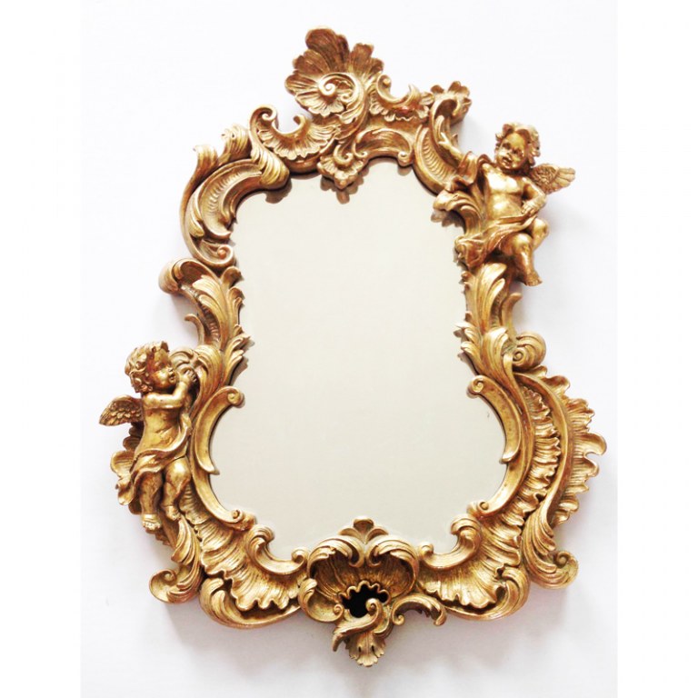 Miroir rocaille à volutes, doré à la feuille d'or, avec angelots chérubins et courbes végétales. Ce modèle de miroir s´inspire des miroirs de style italien que l´on pouvait trouver dans les riches maisons de caractère au XVIIIème siècle