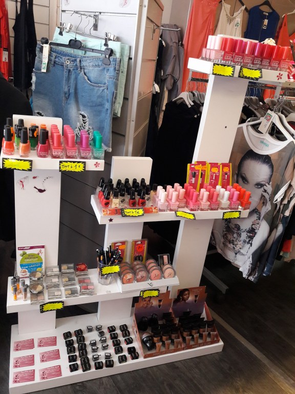 maquillages divers (crayons lèvres, crayons yeux, gloss, blush, fond de teint, ombres à paupières... ) vernis à ongles + présentoir, accessoires beauté limes à ongles, taille-crayons, éponges maquillage, pinceaux, applicateurs, mini parfums...