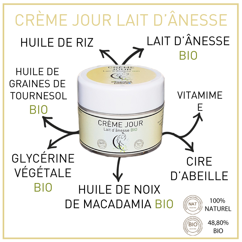 La crème de JOUR au lait d'ânesse Essentiel Nature Cosmétique associe les propriétés exceptionnelles du lait d'ânesse et celles d'autres actifs bio :