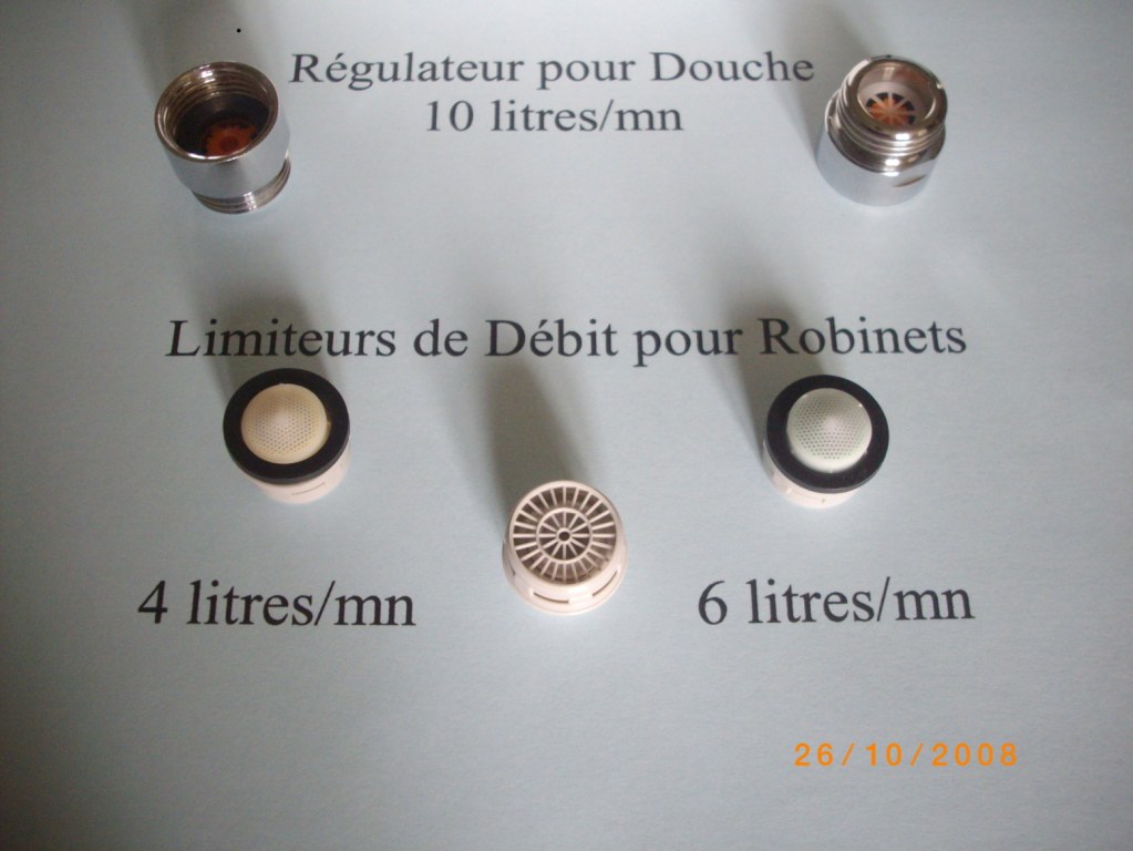 Economiseurs d'eau de qualité danoise, prévus pour tous robinets ... cassette installation standard en remplacement du mousseur grillagé (plus simple car on ne change pas la bague métallique)... celui de couleur crème 4 litres/mn est plutôt dédié à la salle de bain, celui de couleur vert pâle 6 litres/mn pour l'évier de la cuisine ... (plusieurs centaines de disponibles, vendus par lot de 100 pièces et plus au prix de 1€/pièce)