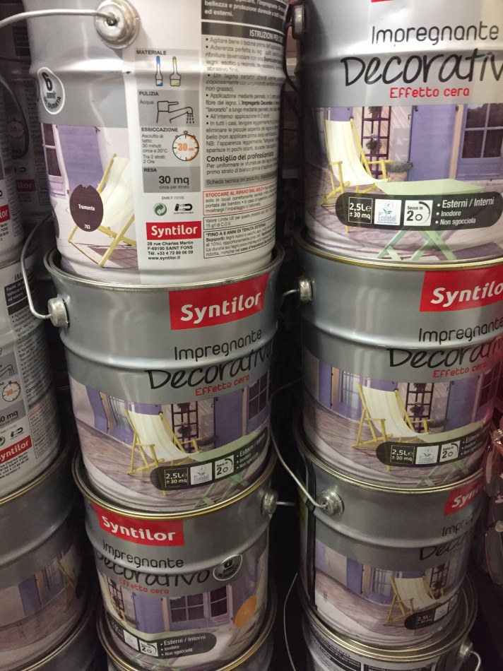 Lot de 72 pots de lasure marque Syntilor 2,5L. Lasure décorative imprégnante effet mat, langage italien. Différentes teintes.