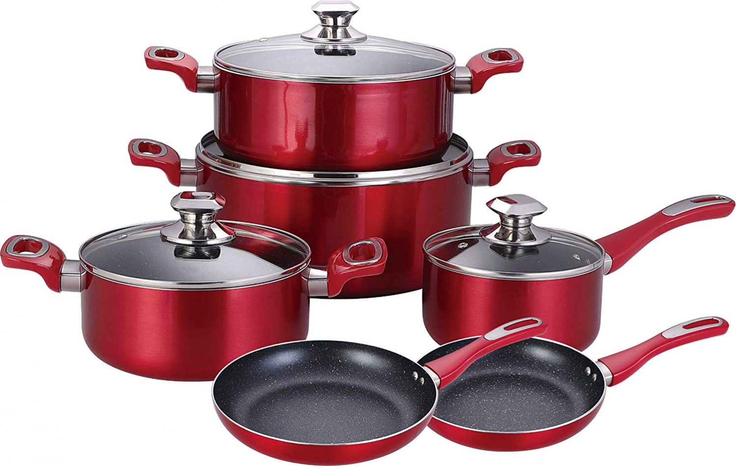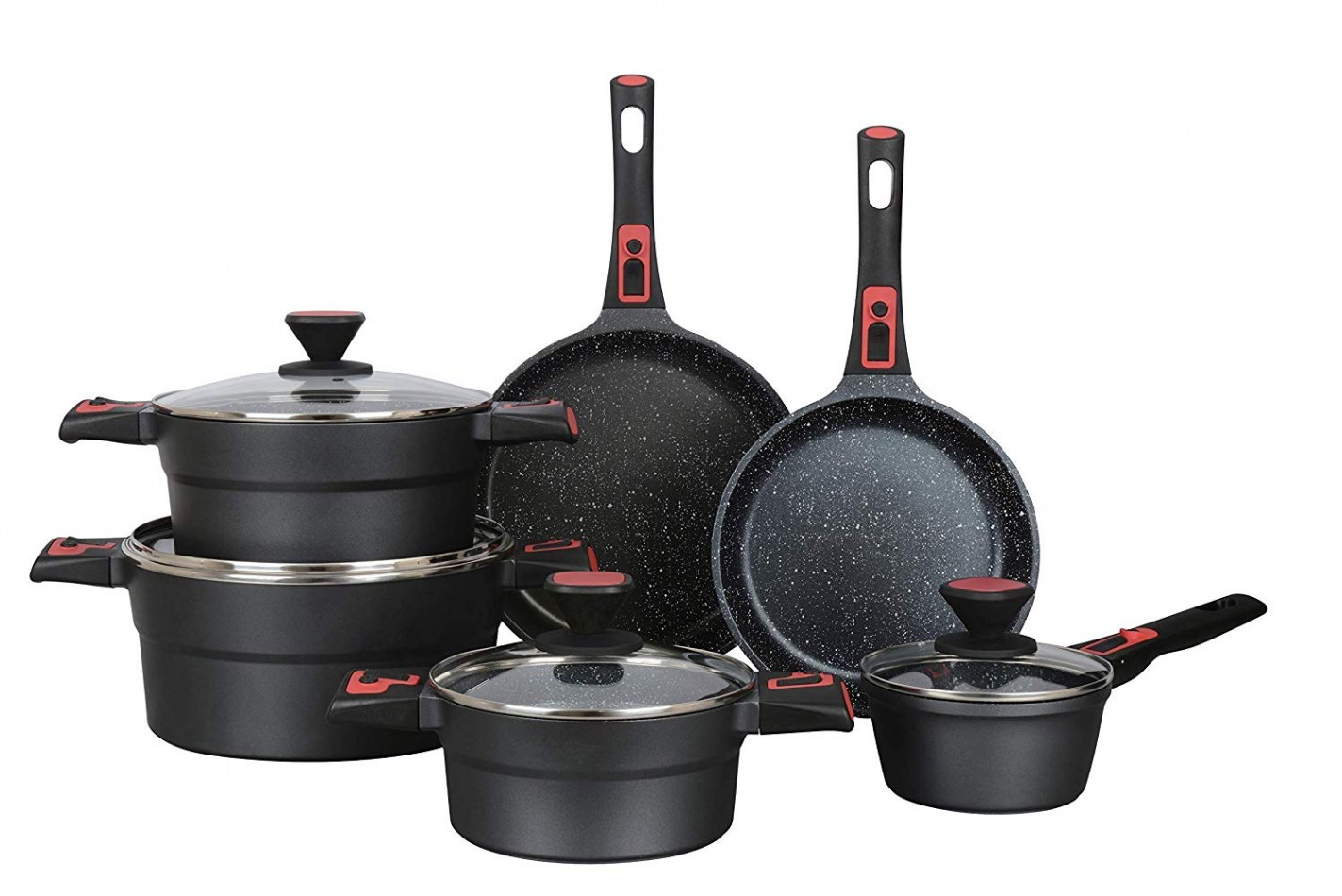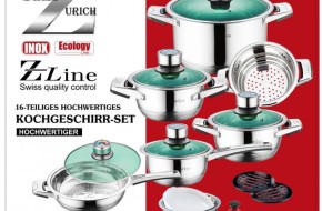 Pot 16 x 8 cm avec couvercle en verre 2,2 litres, Pot 20 x 10 cm avec couvercle en verre 3,1 litres, Pot 24 x 14 cm avec couvercle en verre 6.3 litres, Casserole 16 x 8 cm avec couvercle en verre 1,6 litre, Poêle 24 x 6,5 cm avec couvercle en verre 2,9 litres, Bol à mélanger 20 cm avec couvercle en plastique, Pot à vapeur 20 x 9,5 cm, 2 tapis en bakélite, ventouse