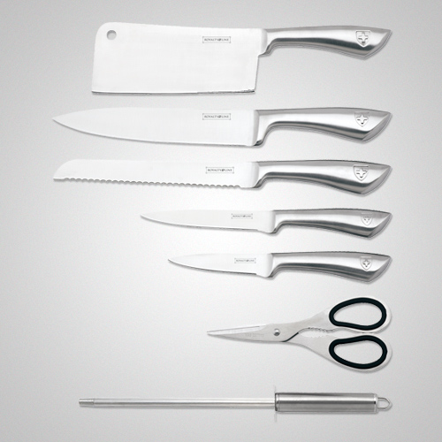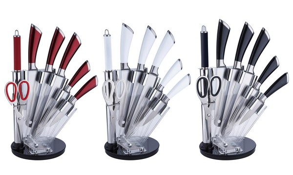 Ciseaux, aiguiseur de couteaux, petit couteau (9 cm), couteau de boucher (17 cm), couteau de chef (20 cm), couteau à pain (20 cm), couteau à multi-usages (13 cm).