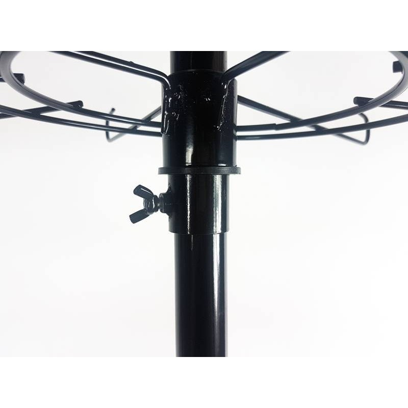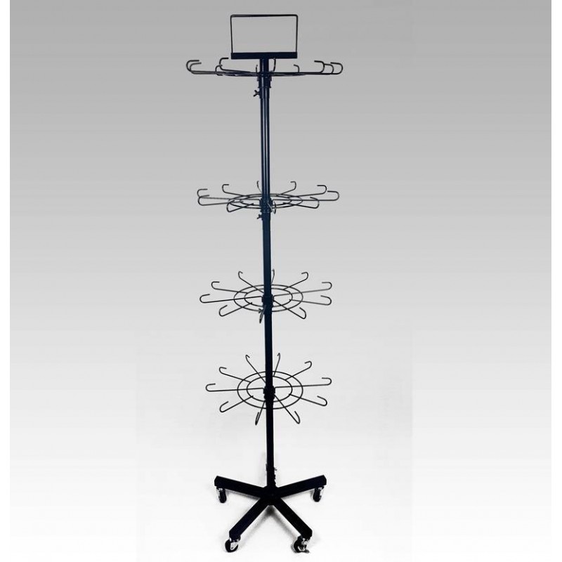 Grand présentoir en métal noir 4 étages de 49cm de diamètre réglables en hauteur, composés de 10 tiges de 10cm de longueur, espacées de 14.5cm au maximum et de 7.5cm au minimum. Tourniquet de 1m75 de hauteur sur 5 roulettes dont 2 avec frein. Possibilité d'obtenir un présentoir de 1m22 ou de 70cm de hauteur en retirant l'une ou deux des barres centrales. Porte étiquette fourni.