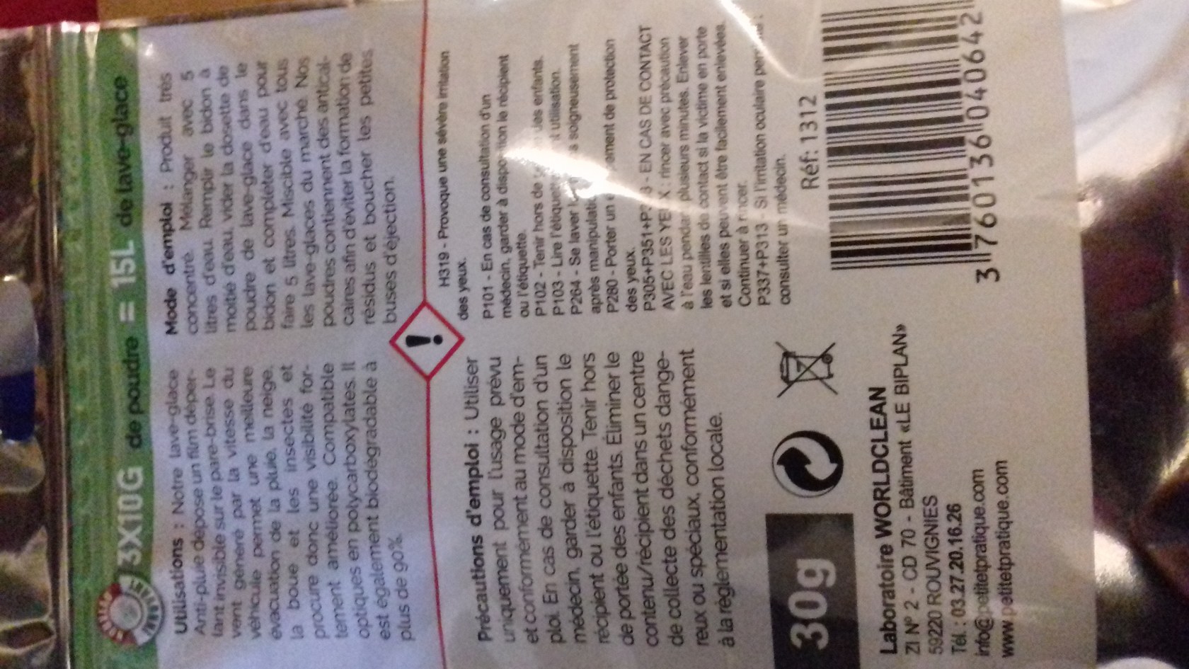 Bonjour je vends sachets comportant 3 dosettes de 10g de lave glace anti pluie pouvant faire 15l de lave glace et oui 15l de lave glace pour 1euro.l'avantage du produit C est que le produit est concentré donc ne prend pas de place et C est un produit français.pour l'utiliser il suffit dans un bidon de 3ou5litres mettre de l'eau courante puis une dosette si pas de bidon remplir votre réservoir lave glace d'eau et m'être la dosette directement