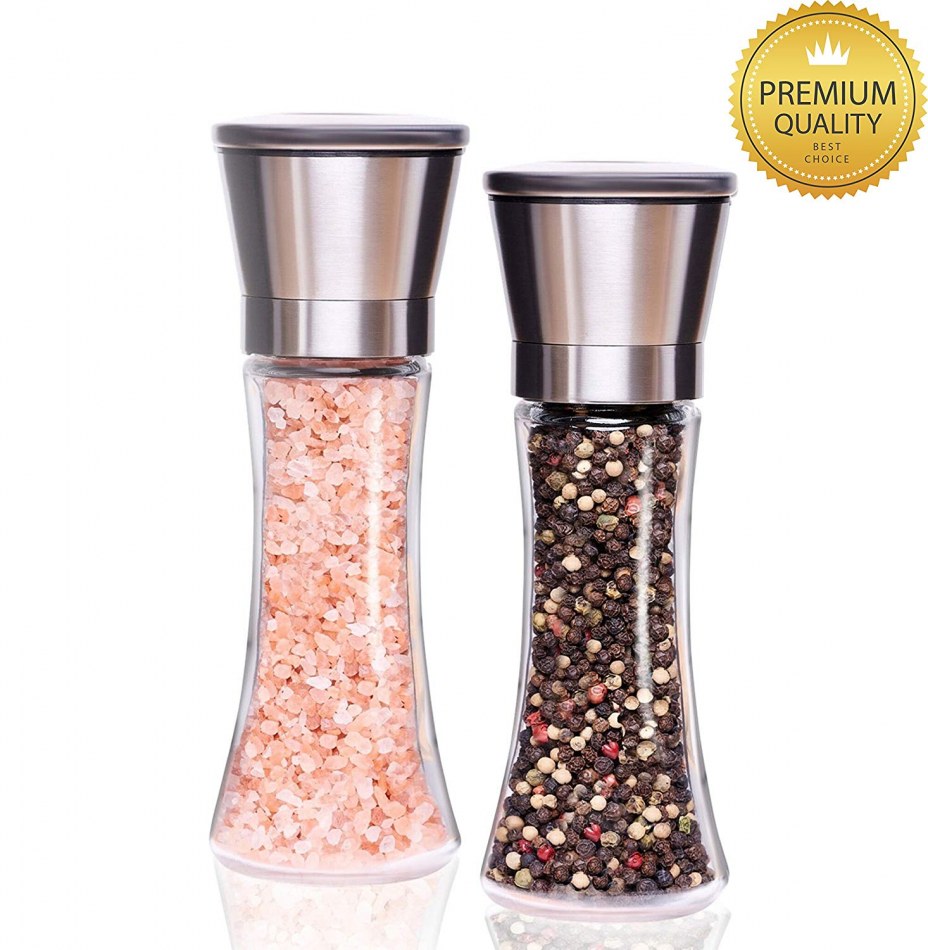 Moulins à poivre et sel en acier inoxydable et verre design de qualité superieur , de grande taille pour une grande contenance de sel et de poivre .Broyeur en ceramique à grain ajustable .