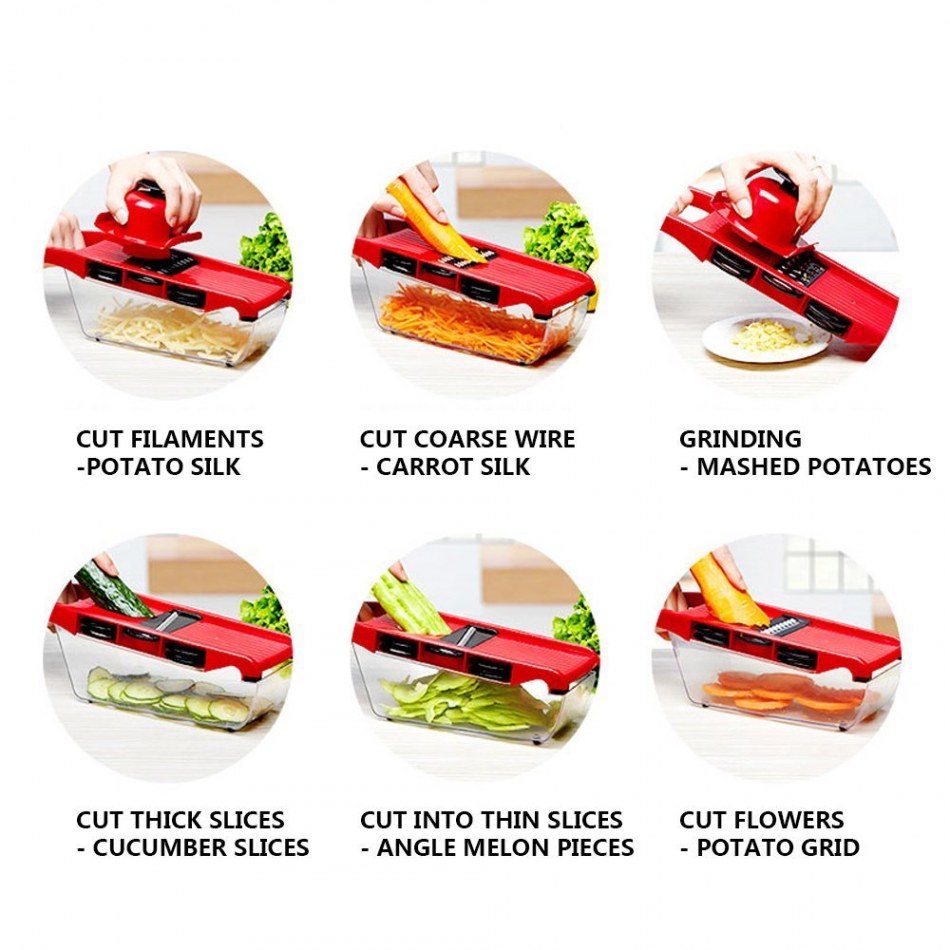 Mandoline de cuisine , trancheuse de legumes et de fruits , multifonction 6 en 1 .Découpez vos aliments rapidement et facilement. Avec ses 6 lames en acier inoxydable vous pourrez raper , slicer et trancher en toute sécurité avec son poussoir .