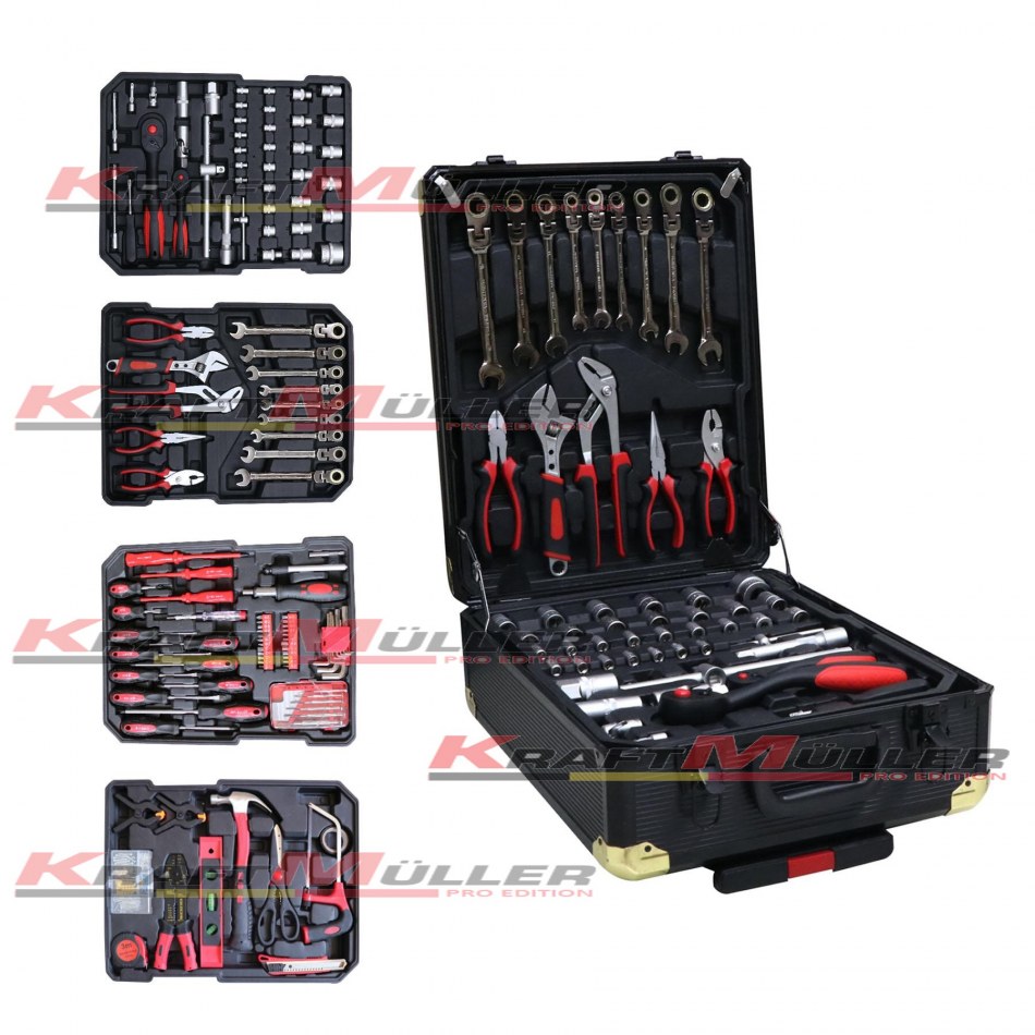 Boîte à outils à 326 pièces à clés articulée composée de malettes en aluminium, fermables à clé avec et poignées amovibles.