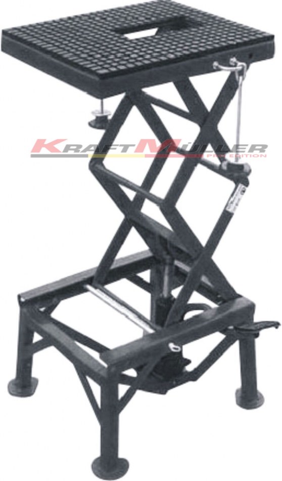 La plate-forme élevatrice garantit grâce à son plateau en caoutchouc dur anti-dérapant et ses ressorts de sécurisation une position sûre pendant toute réparation ou tout entretien de petites motos, scooters ou mobylettes etc...