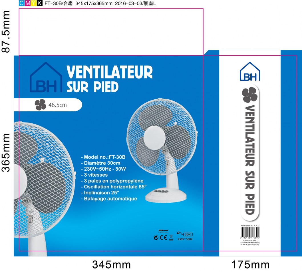 Ventilateur sur table diamètre 30 cm. réf : 1730 Meilleur vente en période d'été, le ventilateur sur table 30 cm est un ventilateur de qualité très facile à monter. Caractéristique: Diamètre 30 cm / 230 V - 50 Hz / 3 vitesses / 3 pales en polypropylène / Garantie 2 ans
