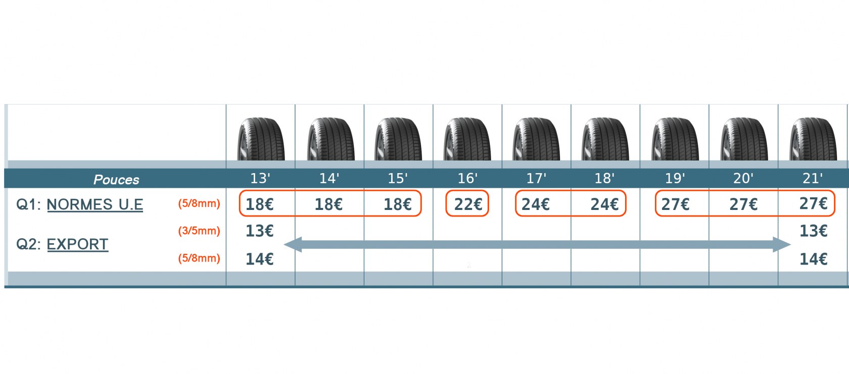 | Normes U.E: | 5/8mm | 18€ | 18€ | 18€ | 22€ | 24€ | 24€ | 27€ | 27€ | 27€ |