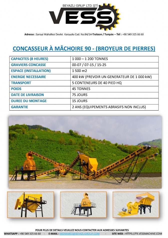Cette unité a pour capacité moyenne 1200 Tonnes par jours. Nous disposons de sa version plus petite c'est-à-dire une version qui produit moins de 1200 Tonnes par jours. Nous avons tout fois aussi des concasseurs a mâchoires qui produit plus de 2000 Tonnes par jours.