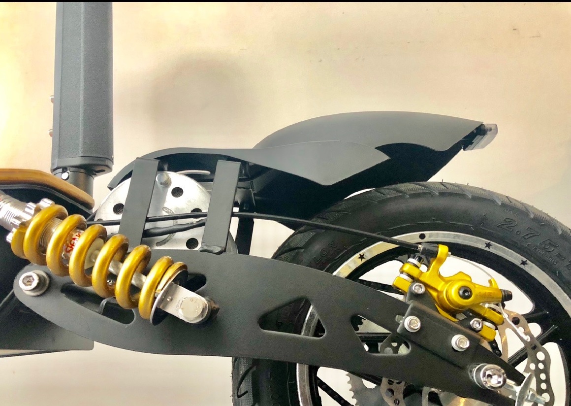 Avec des roues pneumatiques 3" larges off-road, une fourche avant ajustable et deux amortisseurs arrière réglables,