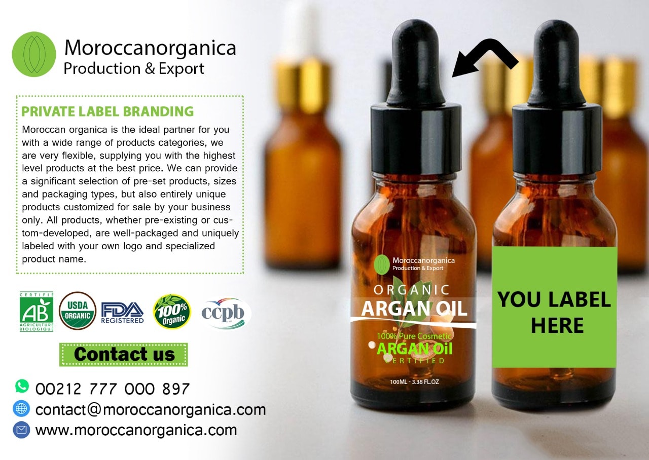 Argan oil company is an oil produced from the kernels of the Argan tree, endemic to Morocco. It is valued for its nutritive and cosmetic properties. Pure and natural Argan oil company has been used in Morocco for centuries to nourish and protect the skin, hair, and nails. Argan oil company contains natural tocopherols (vitamin E), essential fatty acids and antioxidants. Argan oil company is ideal for all skin types, including the most sensitive skins. It is an excellent moisturizing emollient for dry, rough skin and can also be used to add a beautiful healthy sheen to hair, leaving it feeling silky soft and smooth. The oil penetrates the hair shafts unlocking its natural vitamins stimulating hair growth whilst also improving hair elasticity. This process causes the hair shafts to smoothen down increasing smoothness whilst also decreasing unmanageable/ uncontrollable hair. DEODORIZED ARGAN OIL COMPANY: I inform you that deodorizing the oil is part of our filtration process. It is a process totally in cold-pressed process. it's to pass through the oil plates natural active carbon imported from Germany, which is specially designed to deodorize and discolor the vegetable oil. Also, through this process, we arrive at fixing qualities of the oil and neutralize potential risks of germs so we can provide the best quality Argan oil company for wholesale. As you probably know, the use of plates natural active carbon in the field of treatment of drinking water, the air is very old, and is even part of Good Hygiene Practices, and does not affect the quality product. Its use in the field of processing of vegetable oils is relatively recent ... The introduction of this technique in the field of Argan oil company is part of our efforts to research and development that we do not stop to realize the advantage to improve the quality of our Argan oil company and respond with the same Used expectations of our professional customers in the field of cosmetics.