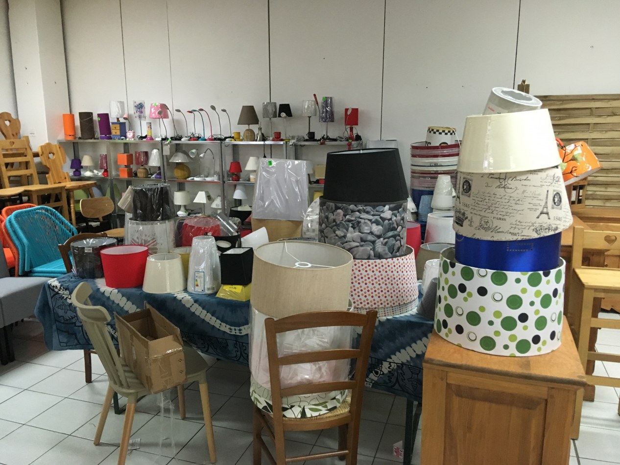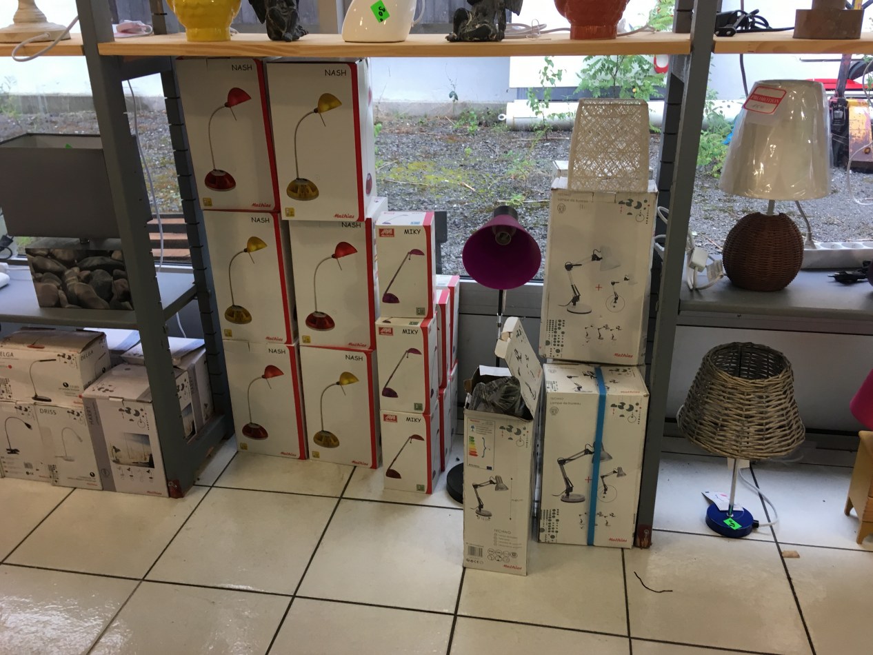 Vend lot de plus de 900 pces de luminaires ( lampes à poser, suspensions, abat-jour... .) et articles de décoration ( poterie, bougeoirs, photophores... .)