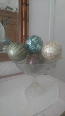 Lot de boules decoratives artisanales "Natura" realisees a partir d'elements naturels: vegetaux, coquillage, corde... recouvert d'une resine polycarbonate fine et resistante.