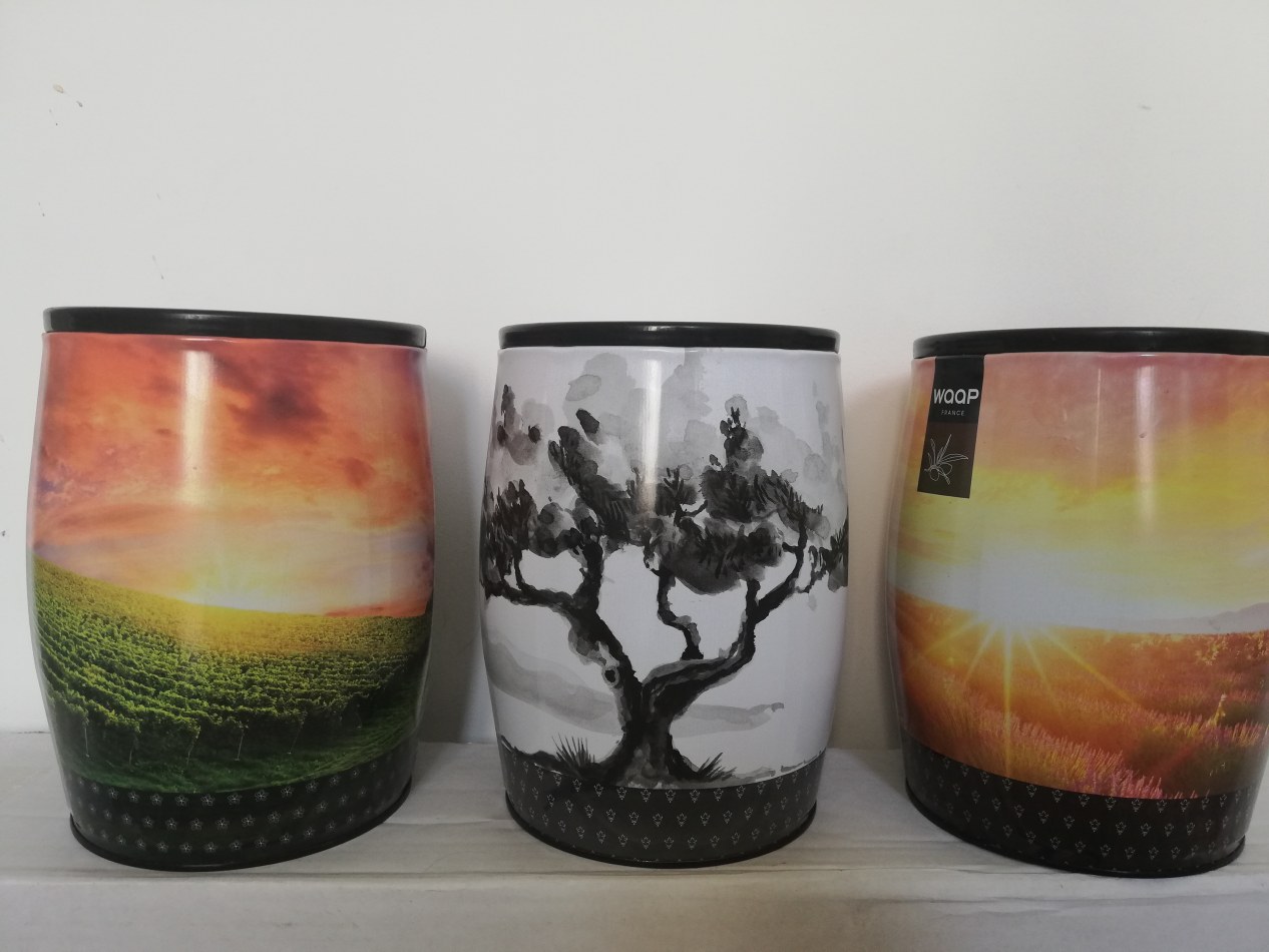 A vendre pour cause de cessation d'activité, Lot de 4.400 tonnelets métalliques décorés pour Bag In Box 3 Litres, pouvant contenir des jus de fruits, huile d'olive ou vin. Idéal pour une mise en valeur de vos produits. Existe en 3 motifs : Lavande, Vignoble, Olivier.