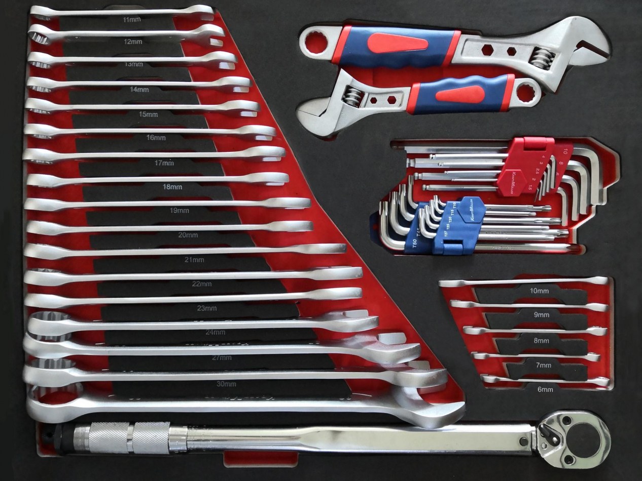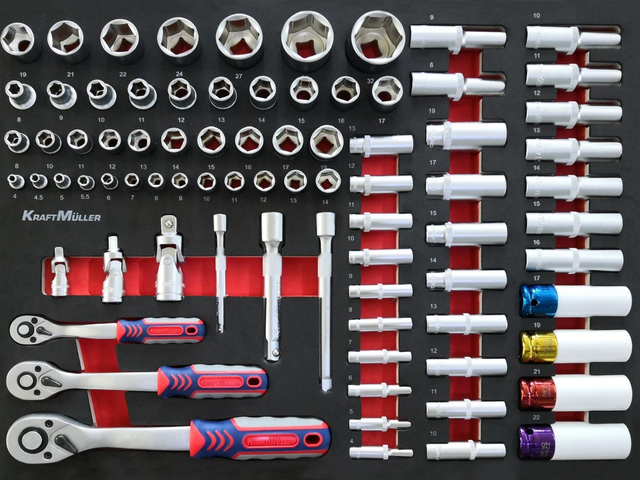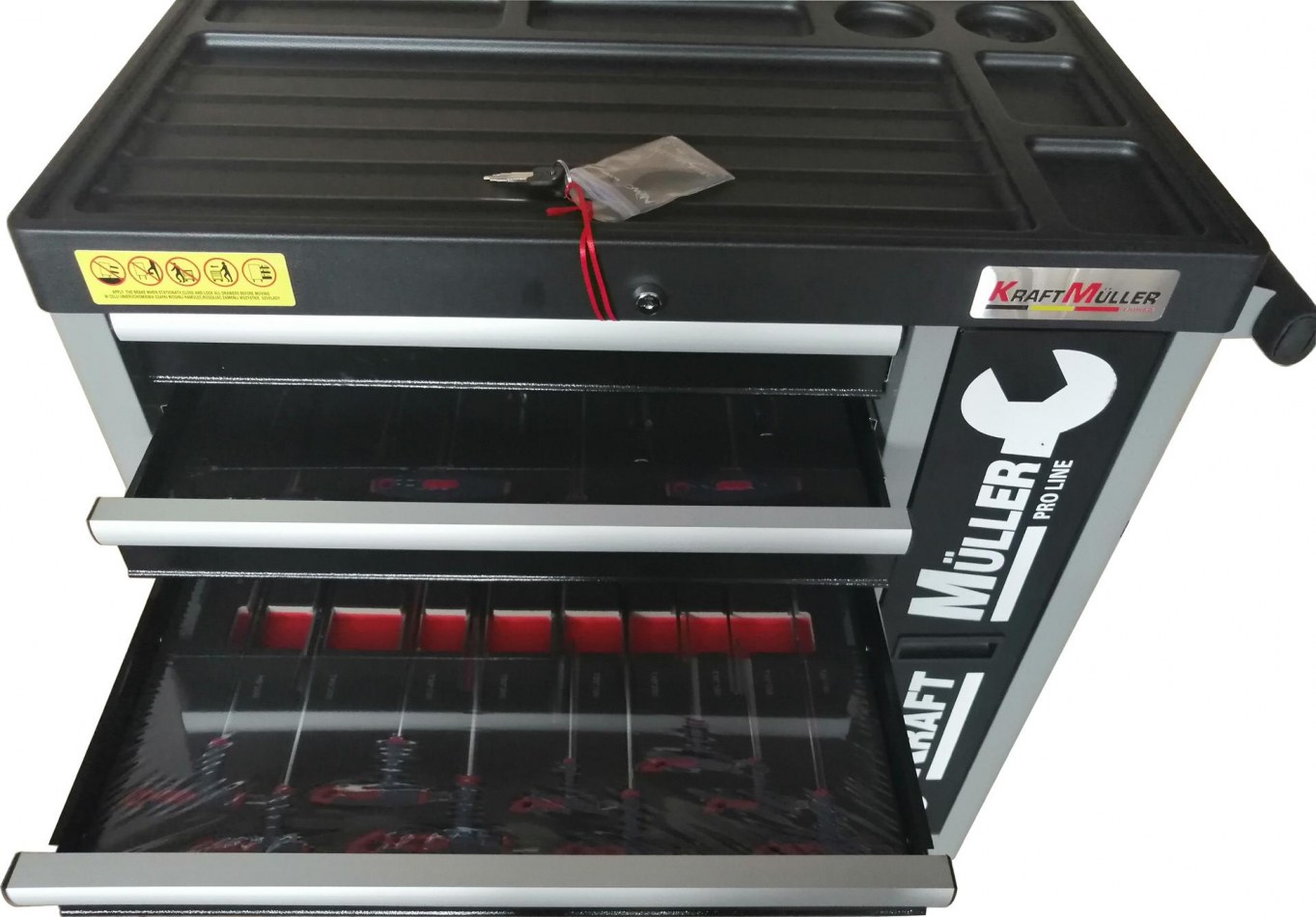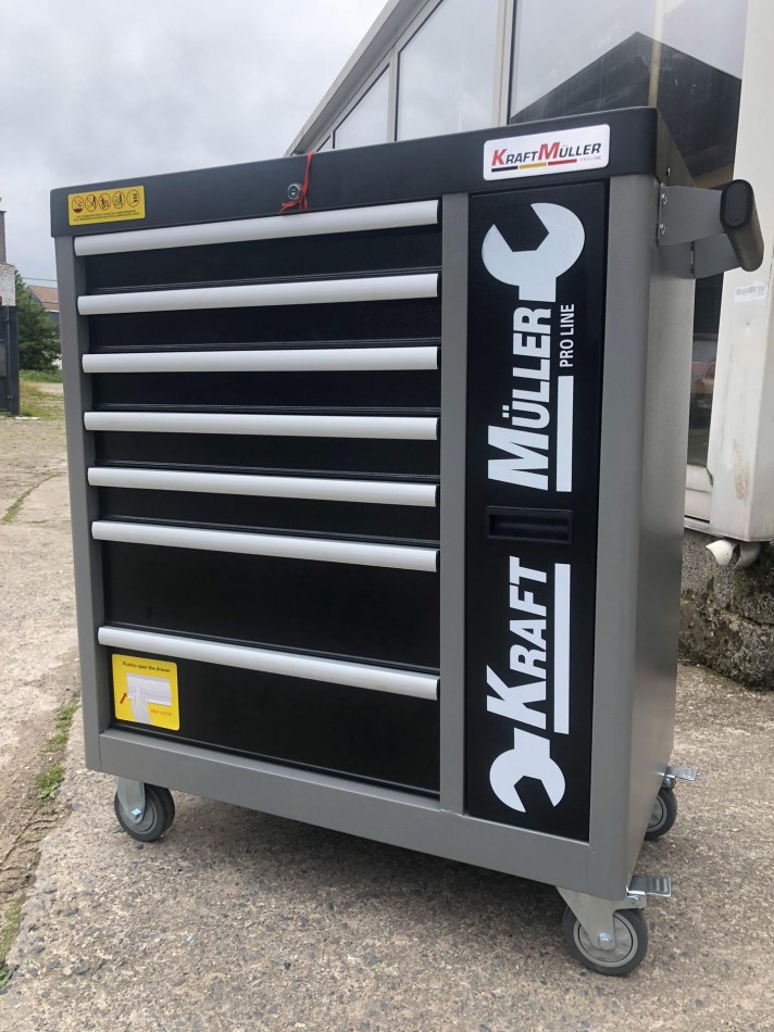 ARTICLE NEUF NOUVEAU MODÈLE 2019 MARQUE ALLEMANDE Servante d'outils professionnels complète Kraft Müller Nouveau modèle Composée de 7 tiroirs pleins comprenant 699 outils Contenant une clef dynamométrique ACIER CHROME VANADIUM - QUALITÉ PROFESSIONNEL DÉTAIL DU PRODUIT: -Poignée ergonomique intégrée dans le plan de travail. -Plan de travail en matériaux antichocs. -Tiroirs montés sur glissière télescopique avec roulement à billes...