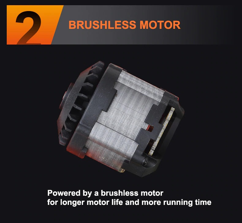 - Le moteur sans balais intégré a un fonctionnement silencieux, fluide et une longue durée de vie