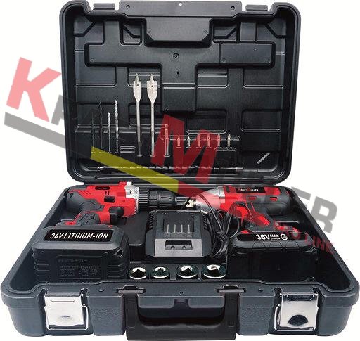 Le kit sans fil kraftmuller regroupe le foret combiné le tournevis à choc à queue hexagonale de 1/4 pouce. Sont également inclus: 2 batteries lithium-ion 36 volts 3,0Ah chargeur et valise de transport.