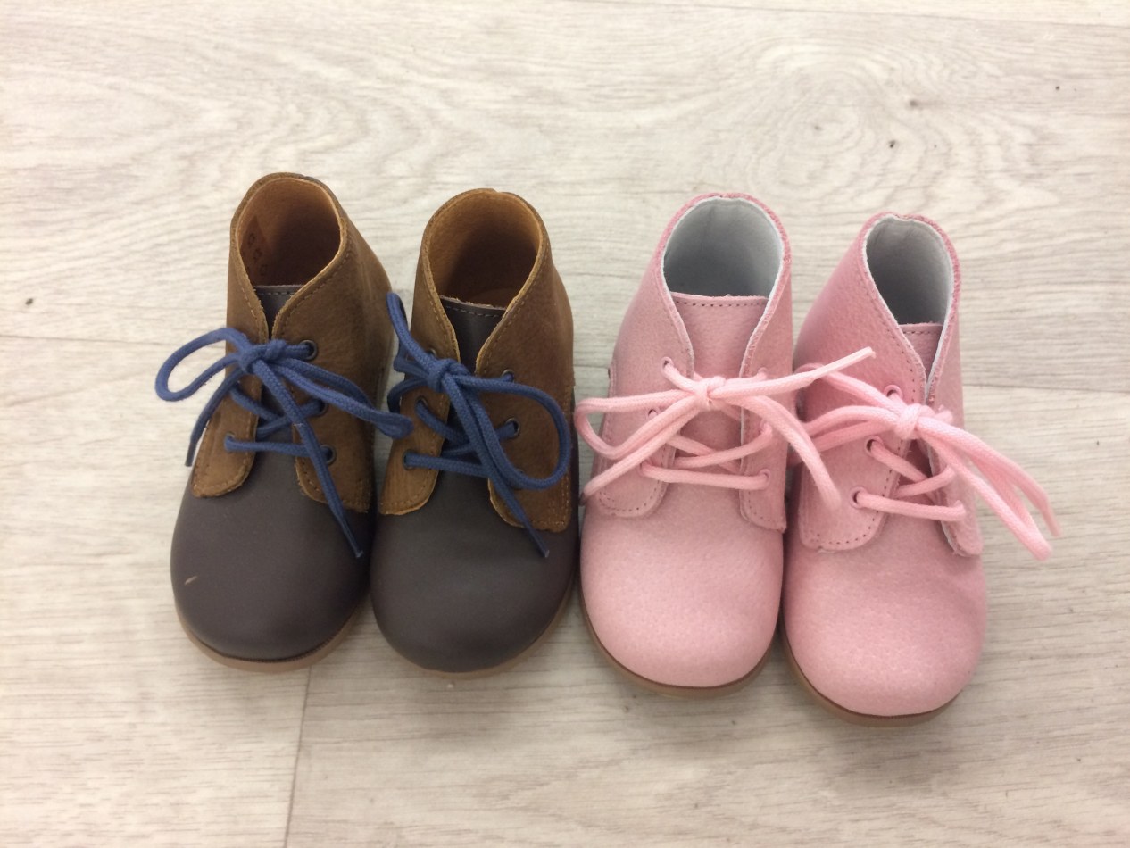 Ce sont des chaussures en cuir (extérieur et semelle intérieure), la semelle extérieure est en TPR ambre, certifiées REACH, fabriqués en France à la main, donc de trés bonne qualité. Deux modèles : rose ou marron/, de la taille 19 à 23 (voir photo).