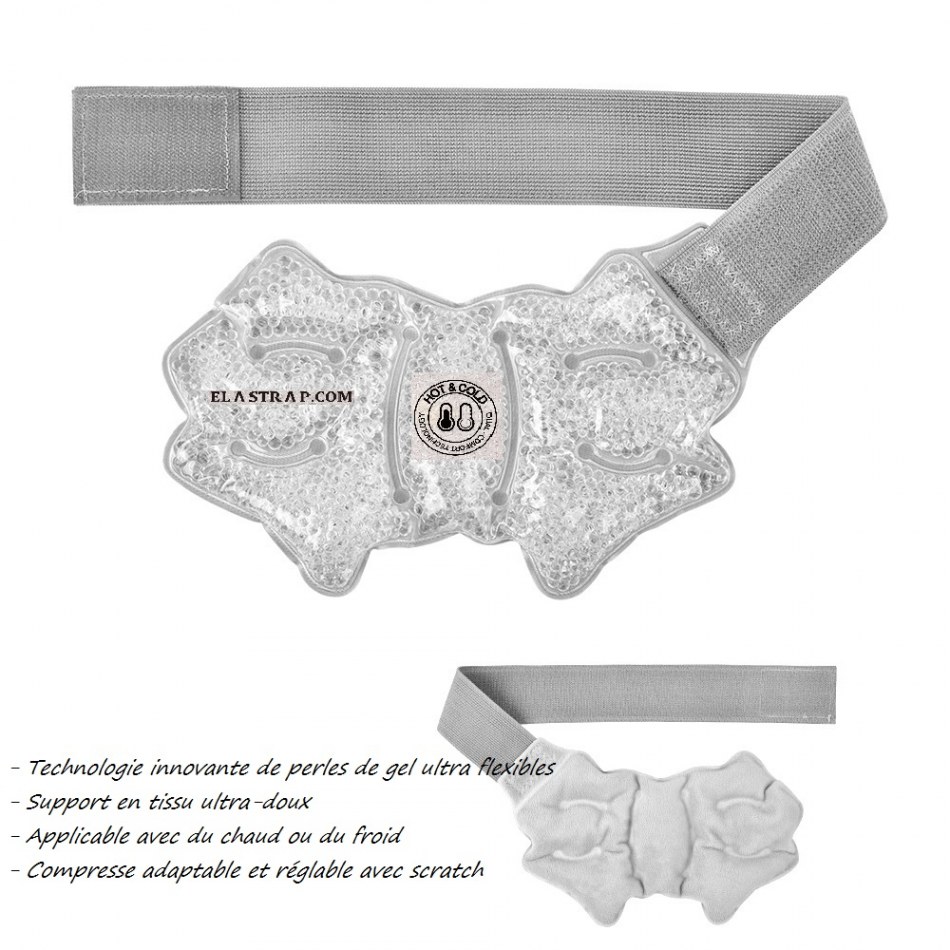 Compresse avec sangle de maintien à scratch. Disponible pour chaque partie du corps (cheville, mollet, genou, cuisse, dos, coude, poignet, nuque, épaule, visage... )