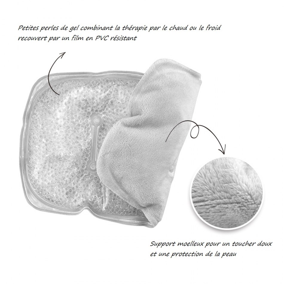 Cette nouvelle technologie apporte flexibilité et malléabilité à la compresse et permet une adaptation parfaite, ce qui permet de mieux envelopper la zone ciblée (dos, cuisse, mollet, coude, nuque, cou, visage, dents, tête... ), sans risque de fuite ou de brûlure. La partie en contact avec la peau reste sèche et douce grâce à la qualité du tissu. Aussi, la température est maintenue plus longtemps qu'une poche de glace classique.