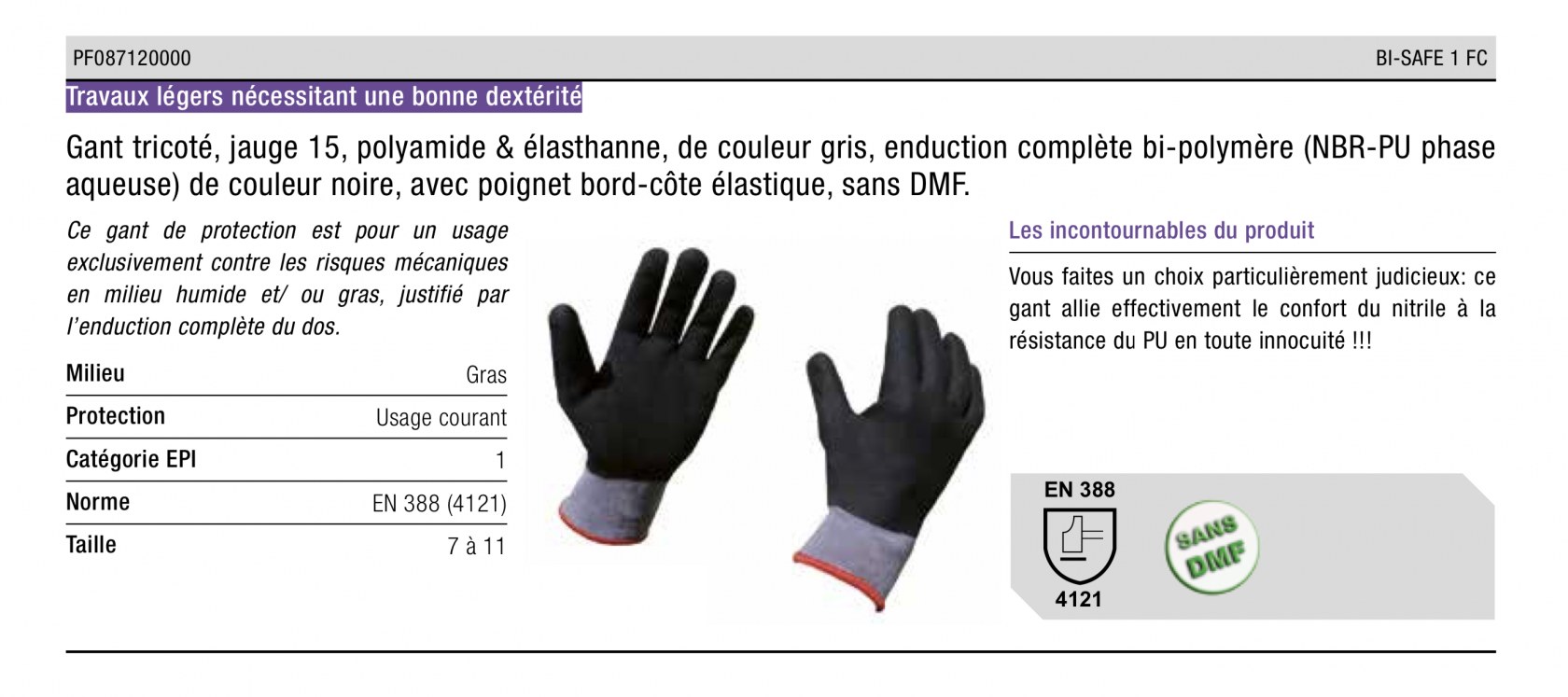 Caractéristique du produit : Gant tricoté, jauge 15, polyamide & élasthanne, de couleur gris, enduction complète bi-polymère (NBR-PU phase aqueuse) de couleur noire, avec poignet bord-cote élastique, sans DMF.