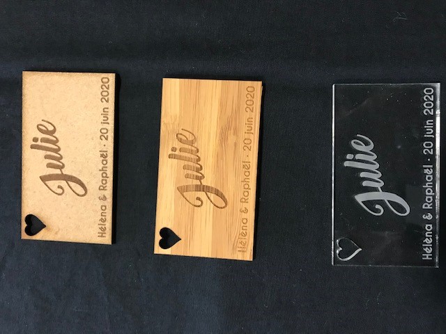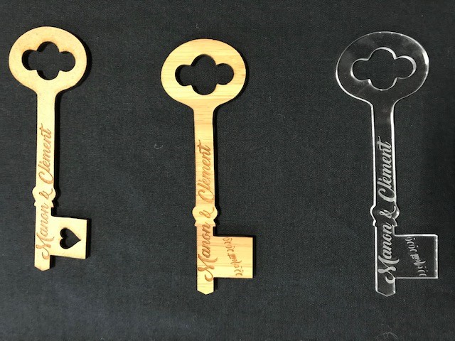 Porte nom bois / plexiglas en forme de clefs / plume personnalisable