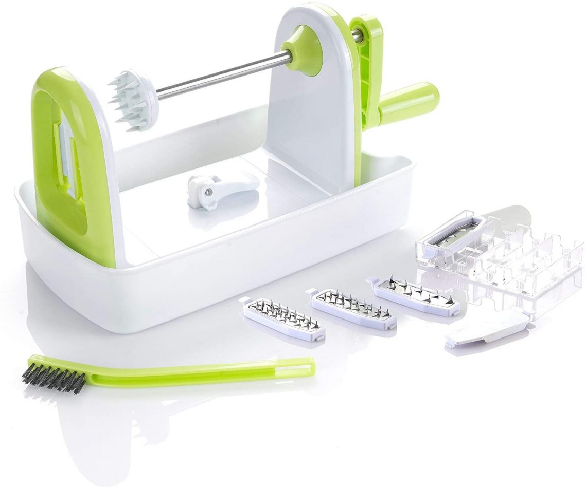 Complètement polyvalent grâce à ses 5 lames en acier inoxydables interchangeables, il est le meilleur spiraliseur pour faire des spaghettis, vermicelles, rubans et nouilles de fruits et légumes.