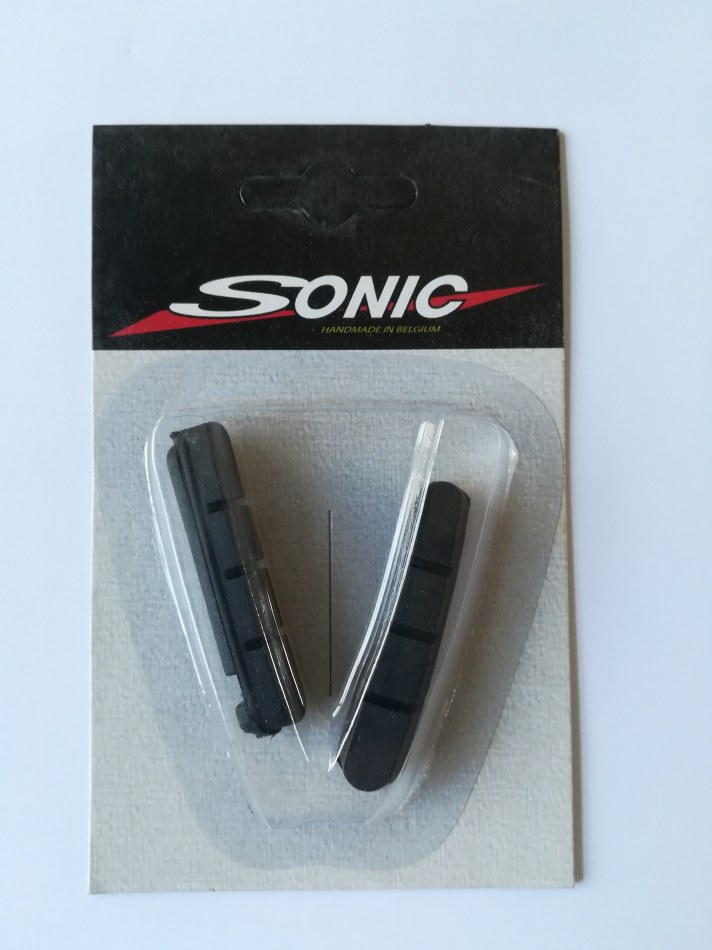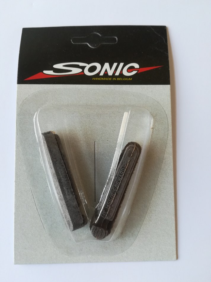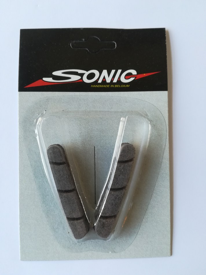 Paire de patins de frein pour freinage sur jante carbone sous blister de la marque Sonic.