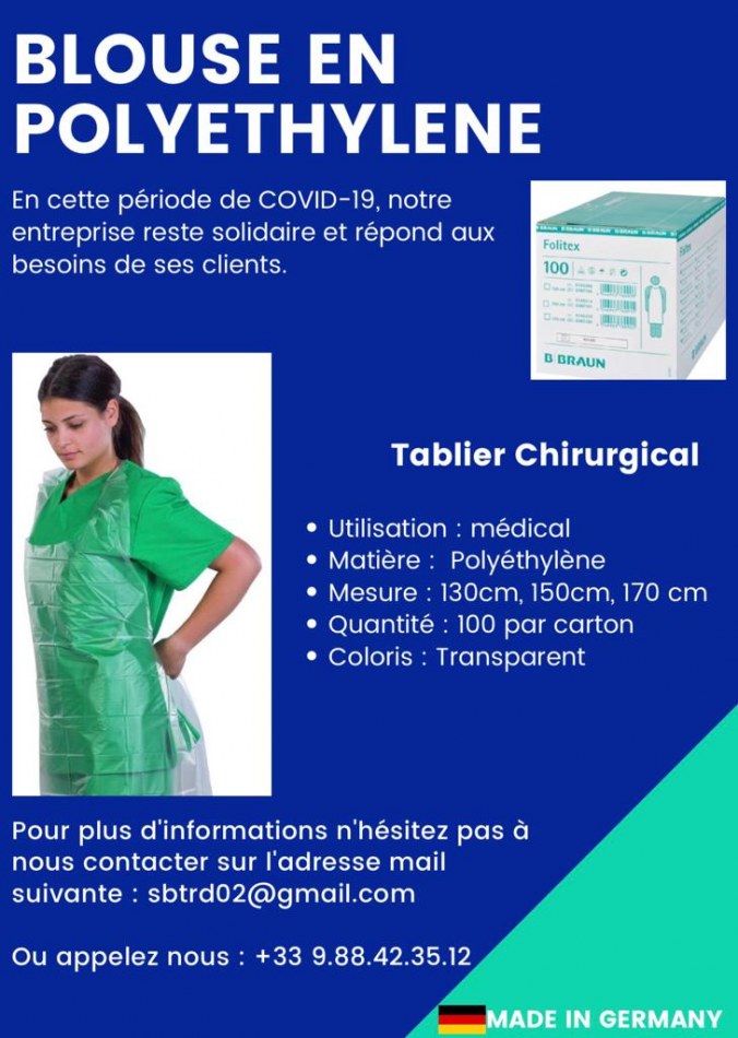 Cette page concerne les Fournisseurs et Grossistes de Tablier de protection Rechercher dans la catégorie : Médical Rechercher dans la catégorie : protection, tablier |