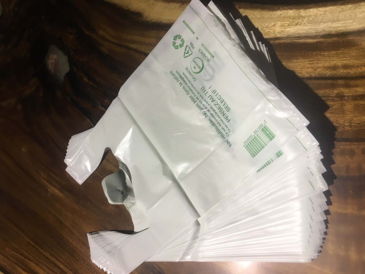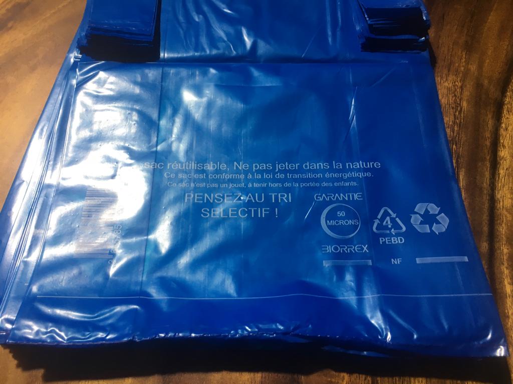 sac bretelles 50 micron dimension 26/12/45 deux couleurs blanc et bleu