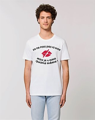 Encolure arrondie et inscription "Je ne fais pas la bise Mais je t'aime quand même !" sur la poitrine. Ou autre slogan (cf voire photo)