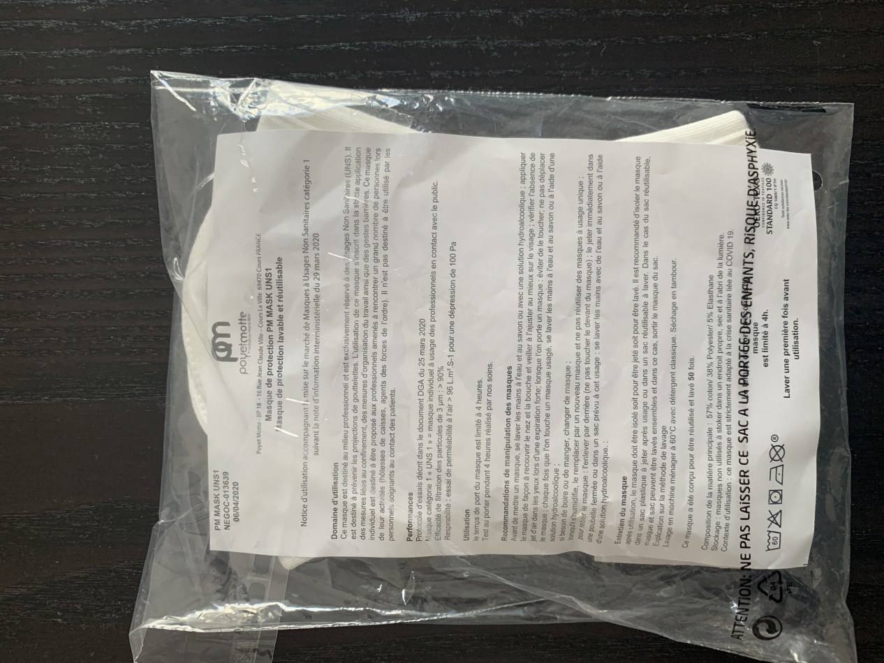 L'efficacité de filtration de ce masque est supérieure à 90% pour la filtration des particules de 3 µm émises (UNS1). Comme tout masque barrière, la durée du port est limité à 4 heures.