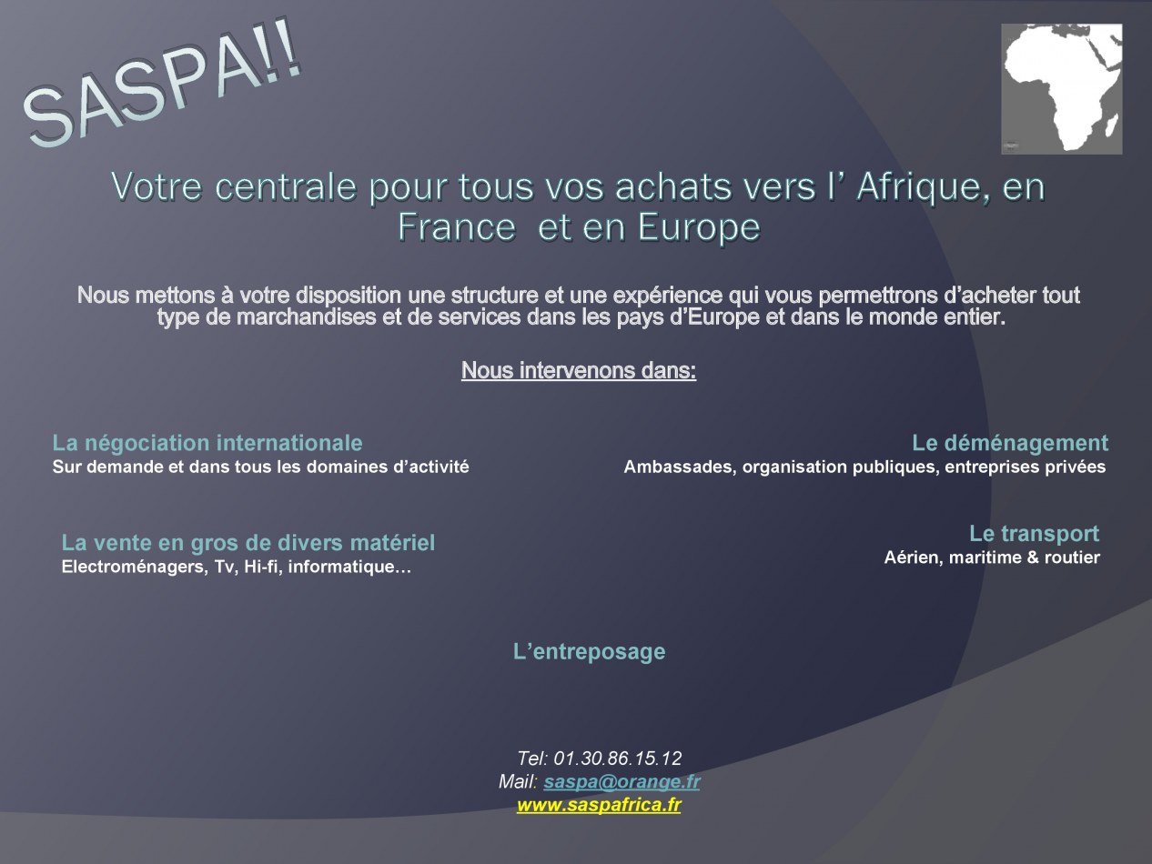 Bonjour, vous cherchez une centrale d'achat spécialisée dans l'achat en gros de matériel à destination de l'Afrique ? Saspa mets 40 ans d'expérience à votre service. Pour plus d'informations, n'hésitez pas à nous contacter au 01 30 86 15 12 du Lundi au vendredi de 9h00-17h et Samedi de 10h-12h30. Cordialement, SASPA