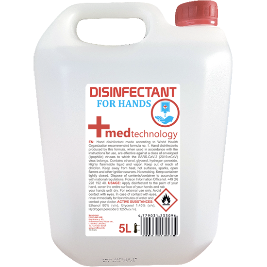 Désinfectant pour les mains fabriqué selon la formule recommandée par l'Organisation mondiale de la santé no. 1. Les désinfectants pour les mains produits par cette formule, lorsqu'ils sont utilisés conformément au mode d'emploi, sont efficaces contre une classe de virus enveloppés (lipophiles) auxquels appartient le virus SARS-CoV-2 (2019-nCoV).