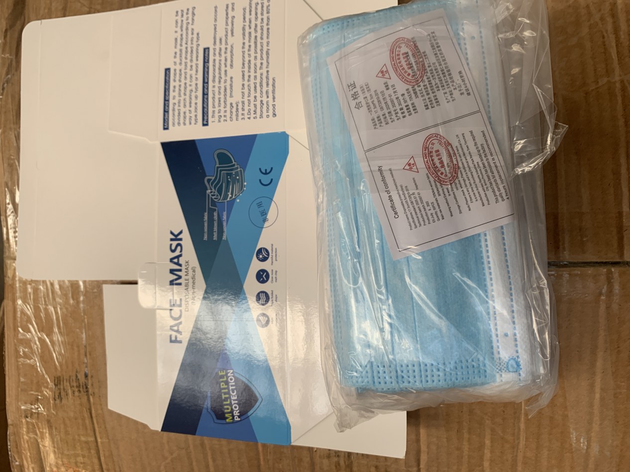 Masque de protection buccale, 3 plis,bleu: matériau non tissé, sans latex avec bandes élastiques, Le masque est léger et confortable à porter,s'adapte a la forme du visage pack de 50 piéces, colis 6000pcs soit 120 boites de 50 masques sa revien donc a 3euros la boite .Possibilité de recuperer la marchandise notre depot